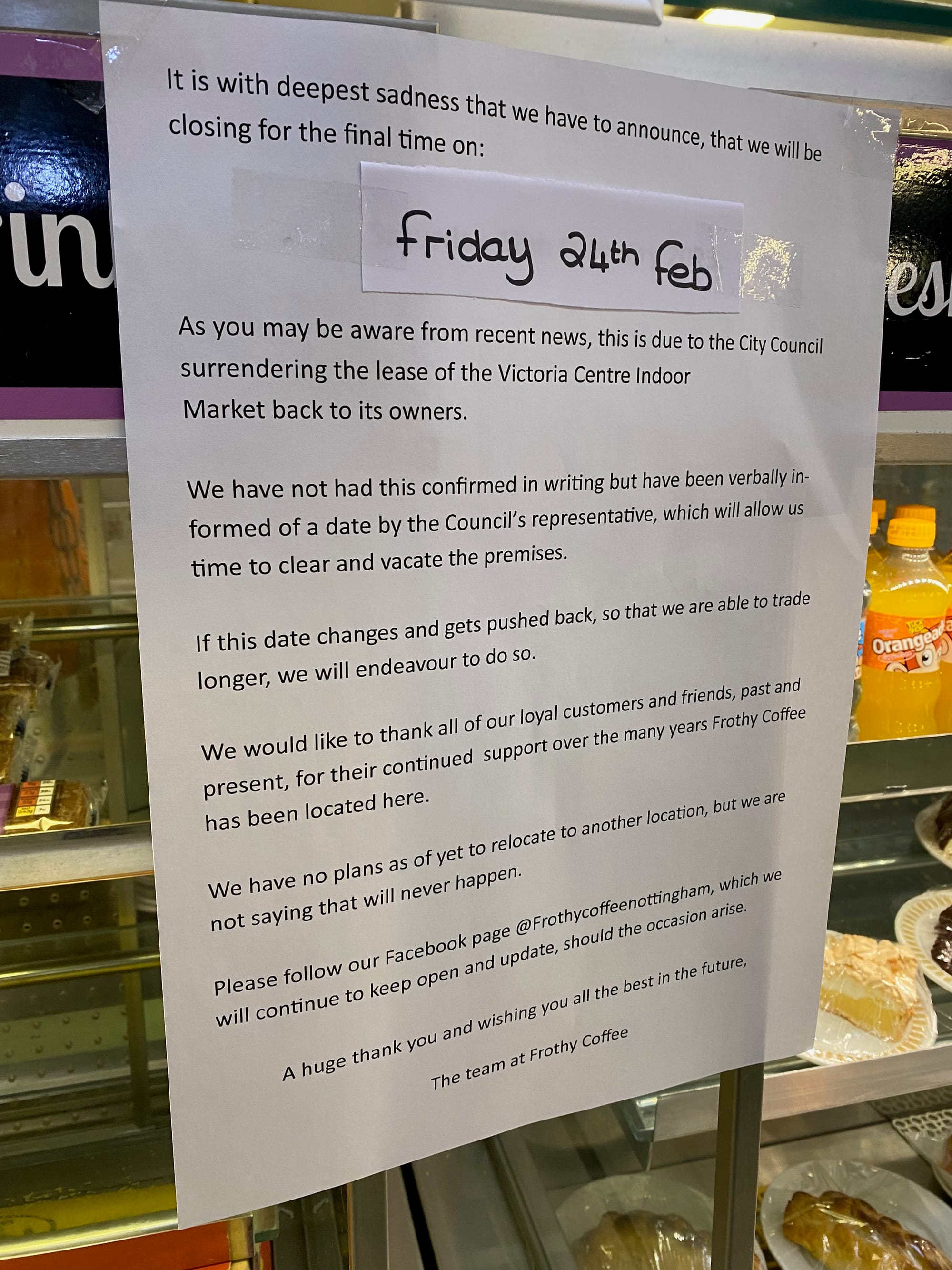 In Victoria Centre news, Victoria Market is still clinging on with just four stalls still open each day. Alladin's Cave, Gemini jewellers, Tick King, and Tracey's Cafe are the last holddouts after the council has successfully pushed everyone else out of their leases early. Itsu are asking for a £39million renewed lease which the two time bankrupt City Council can't stomach. Soon, the market with roots back to the year 1100 will be no more. Read more on the Nottingham Post. This long winded ousting has been going on for some time. Here's the notice that Frothy Coffee posted last year.